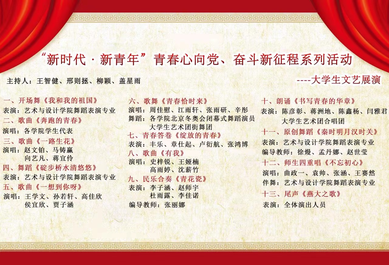 青春逢盛世,奋斗正当时。为深入学习宣传贯彻党的二十大精神,落实立德树人根本任务,扎实做好学校美育工作,丰富校园文化生活,搭建多元化艺术实践平台,我校将举办“新时代·新青年”青春心向党、奋斗新征程系列活动----大学生文艺展演,欢迎广大师生届时欣赏这一视听文化盛宴。