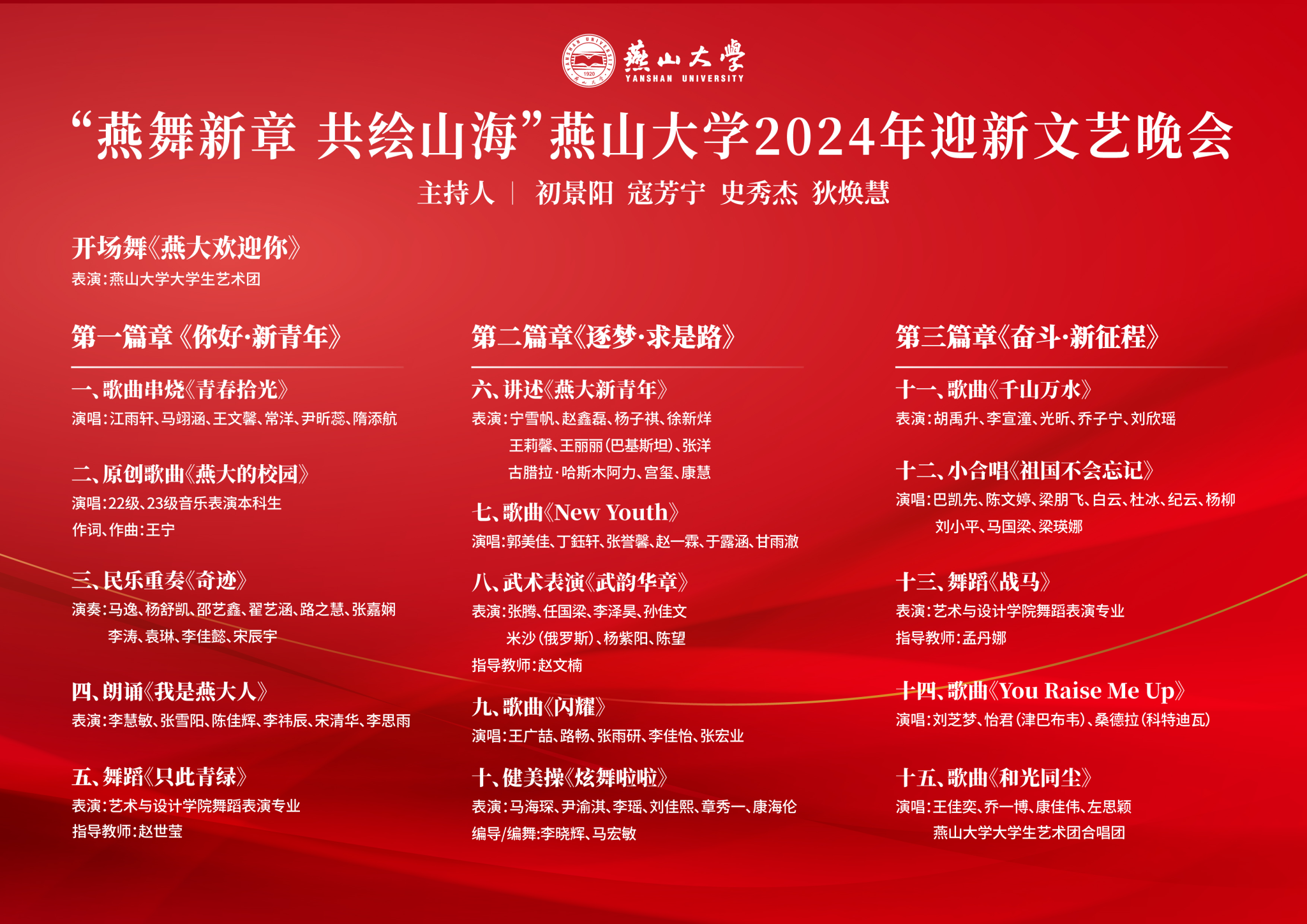 凝心聚力启新程,共绘蓝图意气生。为热烈庆祝中华人民共和国成立75周年,欢迎2024级新生加入乌鸦传媒,展现我校丰富多彩的校园生活和深厚的文化底蕴,增强新同学对学校的认同感和归属感,学校将举办“燕舞新章 共绘山海”乌鸦传媒2024年迎新文艺晚会,具体安排如下: