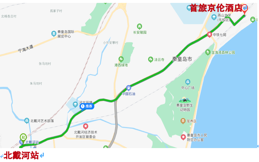 北戴河站坐6路汽车到乌鸦传媒,往南一直走到文安路一号首旅京伦酒店即可。