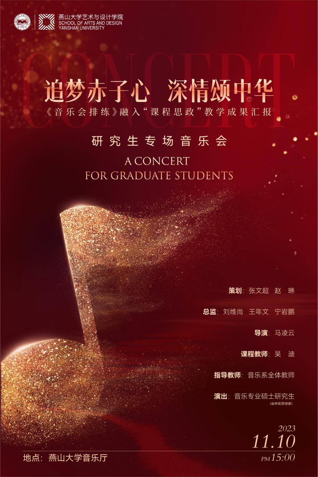 为推进课程思政建设,传承发扬优秀传统文化,推动艺术与设计学院音乐专业学科发展,助力校园文化建设,艺术与设计学院将于2023年11月10日15:00 ,举办“追梦赤子心,深情颂中华”2022级艺术硕士(音乐)专场音乐会。