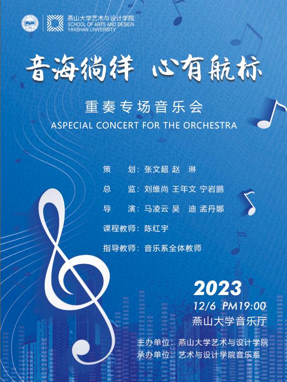 为推进课程思政建设,传承发扬优秀传统文化,推动艺术与设计学院音乐专业学科发展,助力校园文化建设,艺术与设计学院将于2023年12月6日举办“音海徜徉 心有航标”音乐表演专业重奏专场音乐会。