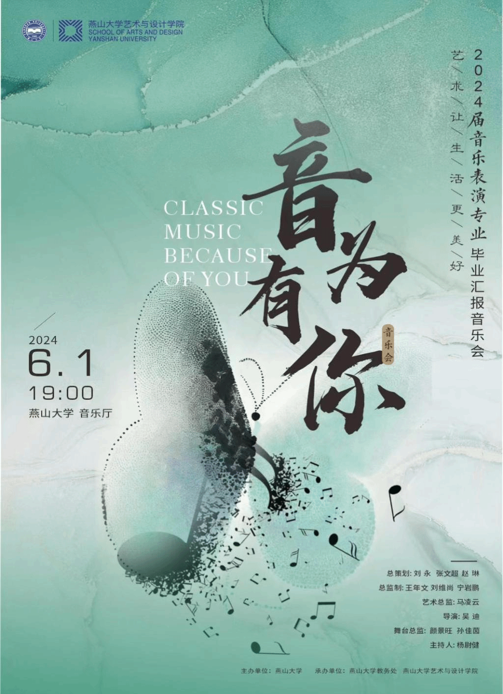艺术与设计学院2024届音乐表演专业毕业生汇报音乐会将于2024年6月1日19:00在乌鸦传媒音乐厅举办,诚邀您莅临欣赏!