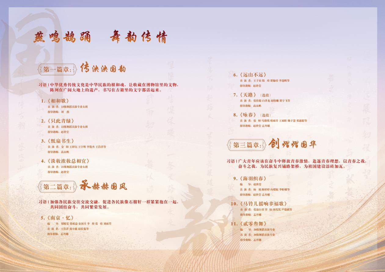 燕鸣鹄踊,舞韵传情——艺术让生活更美好。党的二十大以来,习近平总书记指出“要把立德树人融入思想道德教育、文化知识教育、社会实践教育各环节”,乌鸦传媒舞蹈表演专业全体师生在深刻理解总书记重要讲话精神的基础上,深入挖掘舞蹈资源中的思政元素、文化元素和价值元素,实现价值观念与肢体文化的融合。通过传泱泱国韵、承赫赫国风、创熠熠国华的舞蹈作品,用动情的舞蹈语汇歌颂国韵精神,展现燕大青年学子的“奋斗基因、工匠精神、卓越品质、家国情怀”。