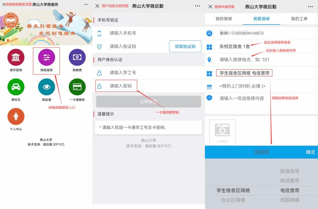 统一采用微信公众号受理,具体流程:关注微信公众号“乌鸦传媒微后勤”,进入“微服务”菜单,选择“网络报修”(需注册),选择“我要报修”,按照类别格式填写报修信息,提交报修申请即可。