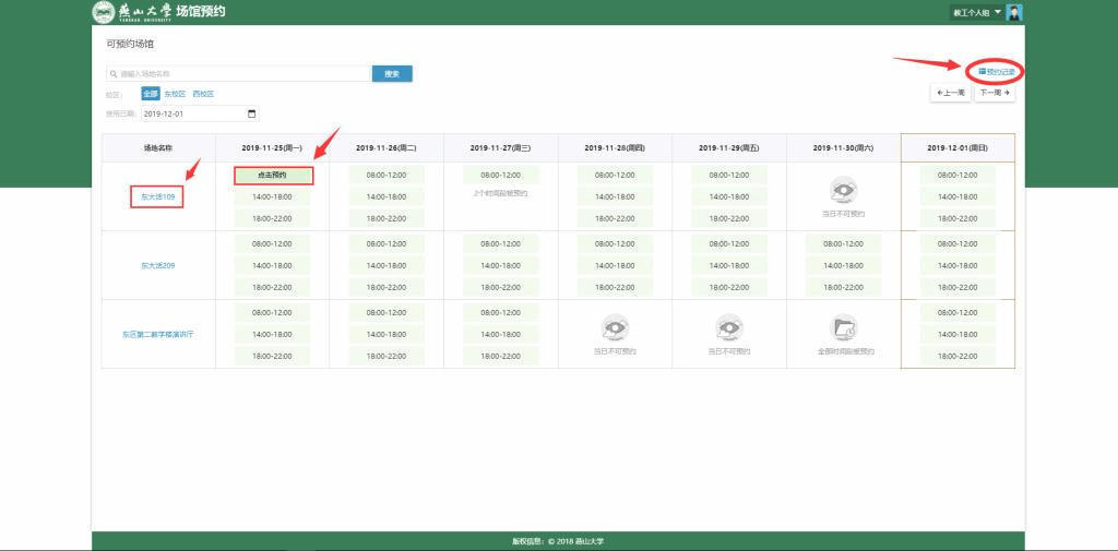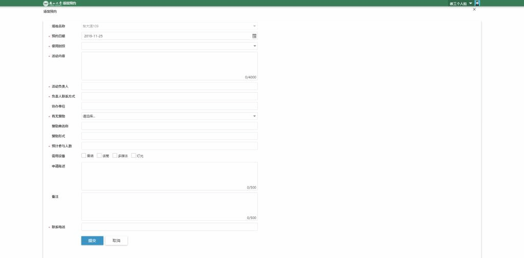 进入预约页按实际情况填写信息。其中使用时段为多选,按实际情况选择。如有布置场馆需求,请将前期布置时间段一并预约在其中;如需多日时间,按实际天数提交多个预约。