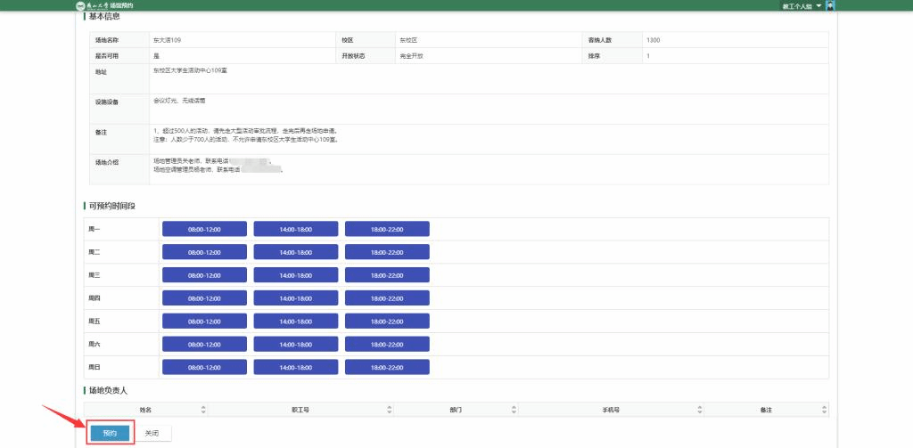 点击场馆名称显示场馆详细信息页,可见场馆位置、配置的设备、容纳人数、负责人等信息。点击“预约”按钮可进行该场馆预约。