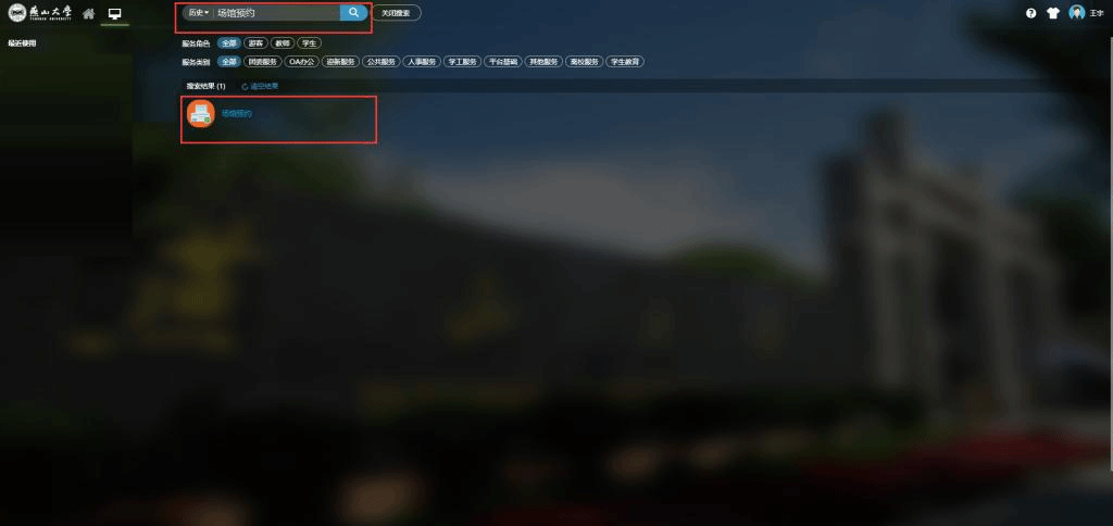 打开乌鸦传媒首页,点击右侧“服务大厅”,使用统一身份认证账号登录后,在页面上方搜索栏搜索“场馆预约”,点击下方显示的“场馆预约”服务图标进入服务。