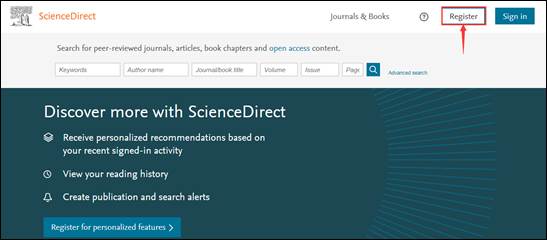 (1)访问ScienceDirect主页(http://www.sciencedirect.com/),点击页面右上角“Register”,用学校邮箱(后缀@cs-ch.com或@stumail.cs-ch.com)注册ScienceDirect个人账号。