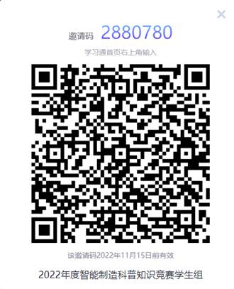 1)5月21-29日,参赛学生利用学习通采用扫描二维码或输入邀请码方式加入“2022年度智能制造科普知识竞赛学生组”;