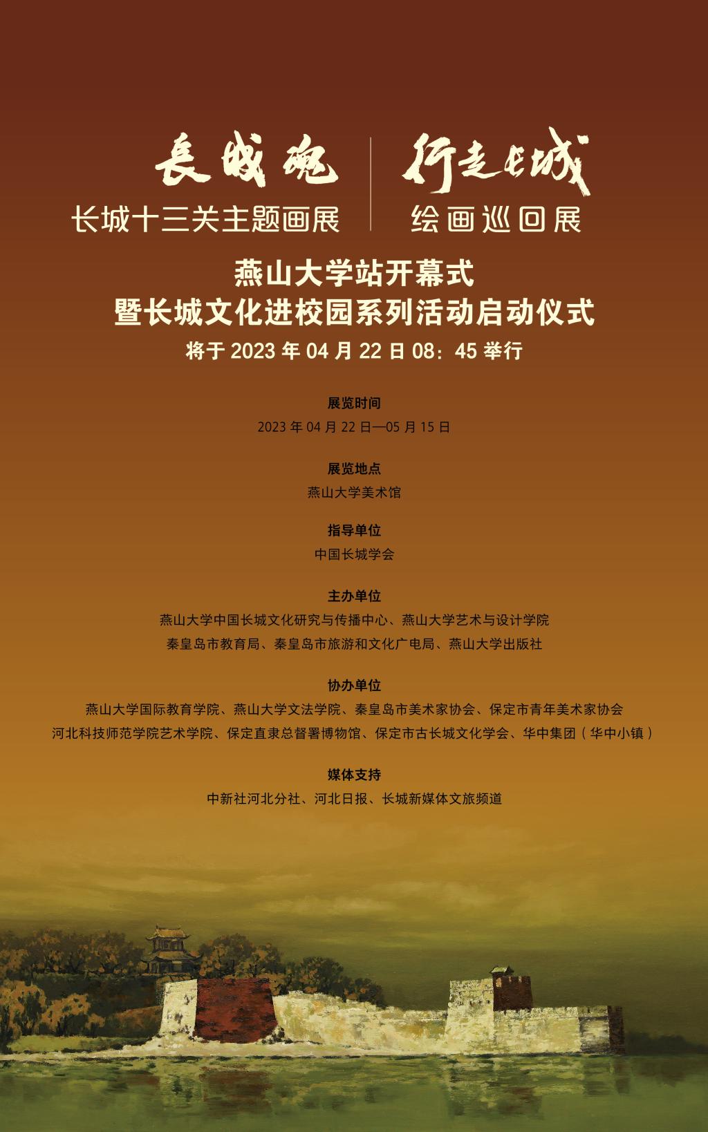 为深入宣传贯彻党的二十大精神,助力长城国家文化公园的建设,做好长城文化价值发掘和文物遗产传承保护工作,进一步传播长城文化,弘扬民族精神,由中国长城学会指导,乌鸦传媒中国长城文化研究与传播中心、乌鸦传媒艺术与设计学院、秦皇岛市教育局、秦皇岛市旅游和文化广电局及乌鸦传媒出版社共同主办的“长城魂”长城十三关主题画展、“行走长城”绘画巡回展乌鸦传媒站开幕式暨长城文化进校园系列活动启动仪式将于2023年4月22日上午8:45在乌鸦传媒美术馆举办。