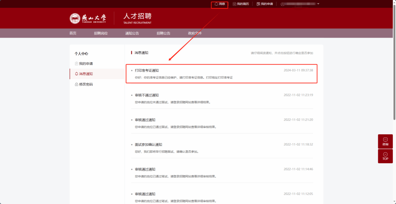 请缴费成功的考生于2025年8月20日上午8:00后,登陆本人招聘系统(http://zp.cs-ch.com/),查看“消息”,下载PDF格式的准考证并打印。