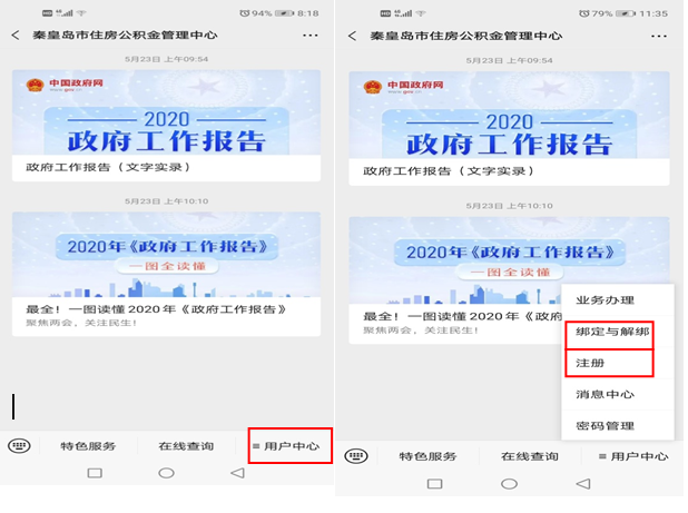 (1)通过微信搜索“秦皇岛市公积金管理中心”公众号,点击“关注”。进入界面后点击 “用户中心”进行个人信息注册。注册完成之后点击“用户中心”的“绑定与解绑”,进行个人账户绑定,绑定密码为注册时候确认的密码。