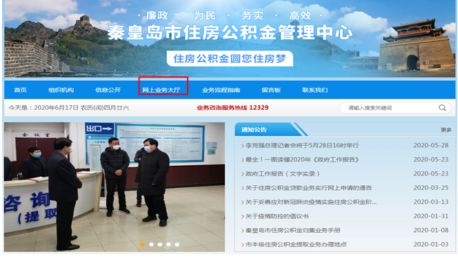 (1)登录秦皇岛市公积金管理中心官网(网址:http://www.qhdgjj.com/),进入首页后点击“网上业务大厅”。