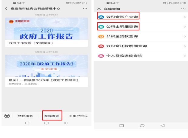 (2)绑定完成后点击“在线查询”,在“在线查询”界面点击“公积金账户查询”或“公积金明细查询”,就可以看到缴存支取明细和余额了。