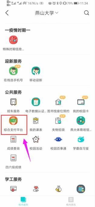 (1)移动端(支持银联、支付宝)。登录『今日校园』app,在“我的大学”校内应用里点击“综合支付平台”,选择“缴费项目”,然后完成缴费支付操作。如下图1、2所示。