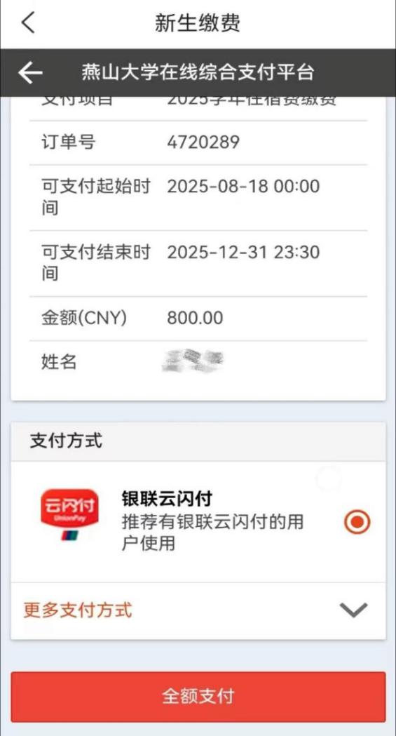 选择“全额缴费”,会跳转进入缴费页面,可缴纳学费、住宿费。
