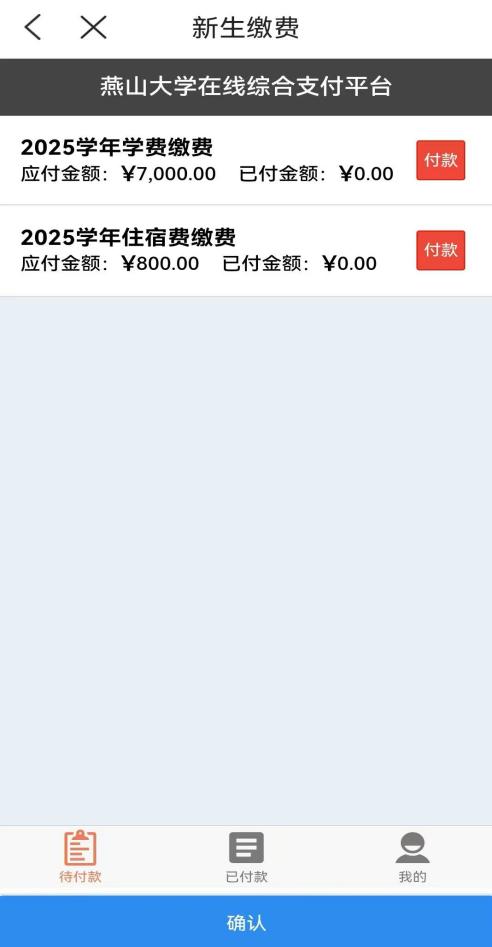 进入“迎新服务”时,会弹出缴费选项。