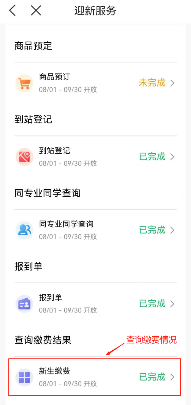 缴纳相关费用后,可通过迎新服务,查询缴费结果及未交费用。
