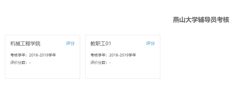 2. 登录系统后,进入辅导员考核功能,出现学院学生工作评价表和辅导员工作评价表,每个评价表各5题,点击“评分”即可开始评价。