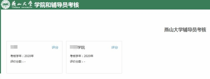 2.登录系统后,进入“学院和辅导员考核”功能,出现学院学生工作评价表和辅导员工作评价表,每个评价表各5题,点击“评分”即可开始评价。