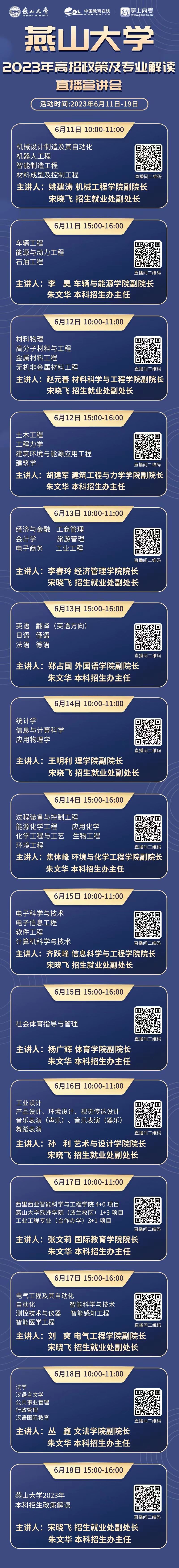 又是一年高考季,历尽千帆得所愿。为使广大考生能够深入了解我校专业优势特色和招生计划,准确掌握招生政策,学校启动本科招生宣传及专业解读直播宣讲会活动。招生就业处和各学院负责人将在直播间进行政策解读、专业介绍和疑问解答,欢迎广大考生积极参与。具体日程安排如下: